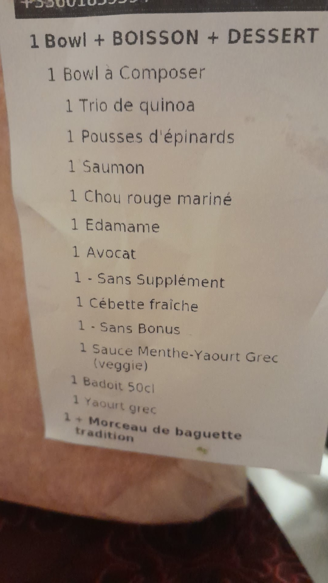 Posté le 28/09/2023 à 20:23"J'ai commandé un bowl avec supplément cebette, je la cherche encore... sauce très insuffisante, le bowl était super sec. J'ai payé 0,50€ pour un morceau de baguette tradition, vous avez en photo ce que j'ai eu, je ne sais même pas ce que c'est. Et le yaourt avec speculos, même pas un demi speculos émietté et deux myrtilles écrasées. J'ai aussi demandé des couverts, étant à l'hôtel... ben je cherche aussi les couverts. Absolument lamentable !!!"